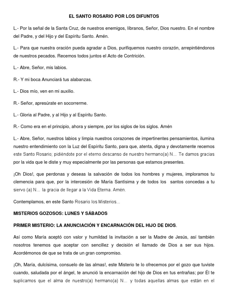 El Rosario de los Difuntos es sumamente extenso por lo que vamos a mostrar solamente los Misterios Gozosos léanlo con detención pero no es necesario que lo copien pues al final de esta página se les entregará el link para que lo bajen completo con todas sus partes. El libro del Santo Rosario para difuntos en pdf se reza para pedir la intercesión de la Virgen María por una persona fallecida por lo que lleva prácticamente la misma estructura que el que se reza comúnmente. Santo rosario para difuntos lunes pdf Wednesday March 23 2022 Edit-Por todos los que están por dejar este mundo para que se arrepientan de sus pecados y entreguen su vida a Cristo como ofrenda agradable.